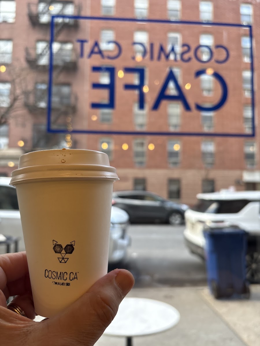 Does Cosmic Cat Cafe allow dogs? Yes, they seem to have a lot of regulars that enter for treats. I had the best cortado in NYC at Cosmic Cat Cafe. The coffee shop is very clean and warm. I was welcomed by a barista who was warm and friendly. I ordered a cortado with oat milk. I could taste the boldness of espresso along with subtle notes of the beans, and the steamed milk smoothed and balanced the flavors so well. I thoroughly enjoyed each sip. I didn’t get the barista’s name but they were the only worker at around 8:45am on Friday 6/14. A regular named Midnight walked in and enjoyed some treats given by the barista, which was a very sweet sight to see. If you’re looking for good coffee in NYC, this is the place.